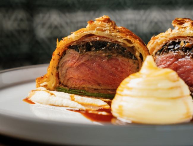 - 180g Grainge Black Beef Tenderloin MB2+, Mushroom and Madeira Duxelles, "Proper" Mash, Parsnip Puree, Pan Jus.